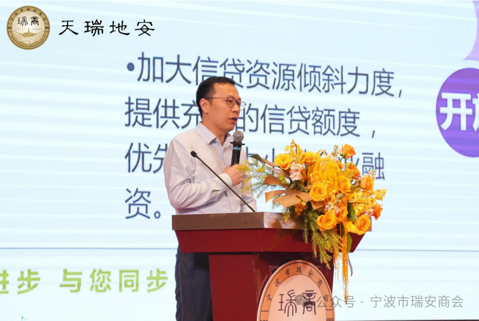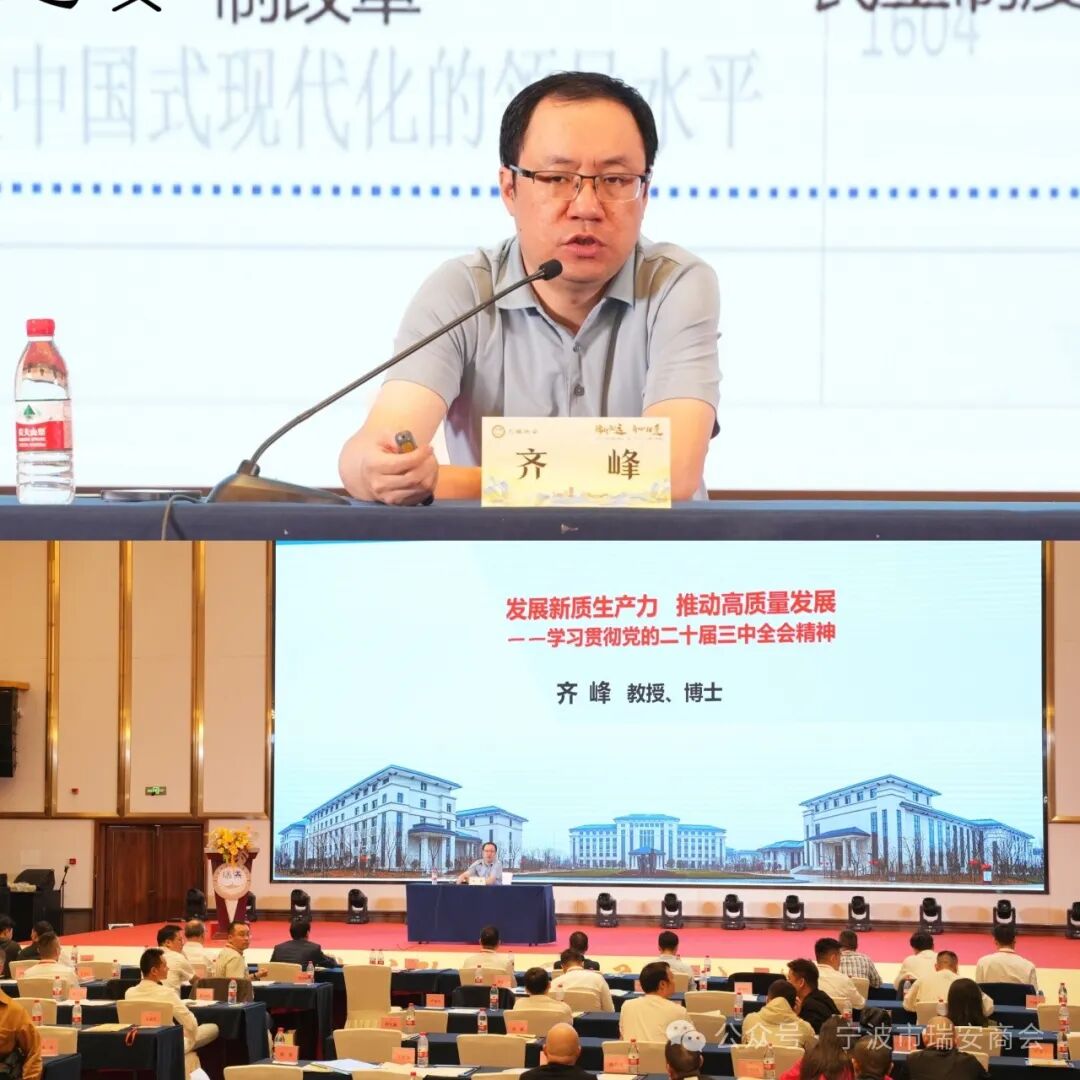 秘书长季光旋对宁波市瑞安商会自2023年换届以来秘书处的工作回顾并对2025年工作作计划。市情研究所副所长(主持工作)、教授、法学博士,浙江省党建研究会常务理事,宁波党建研究中心(城市党建智库)主任,宁波市党建研究基地首席专家齐峰教授解读《学习贯彻党的二十届三中全会精神》——发展新质生产力,推动高质量发展。齐峰教授深入浅出的讲解,让大家对党的二十届三中全会精神有了更为深刻的理解。相信这些宝贵的知识和理念,将会在商会未来的发展中发挥重要作用,激励大家在党建引领下不断前行。宁波市瑞安商会会长应晓东&中国邮政储蓄银行镇海区支行行长苏志敏达成合作,进行签约。同时,中国邮政储蓄银行镇海区支行副行长吴海忠详细解读银行优惠政策产品。会长应晓东致辞