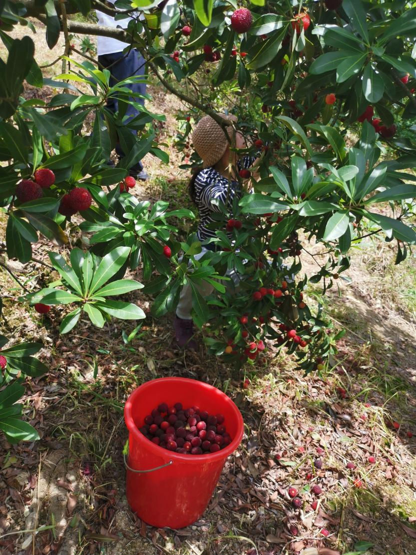 集合完毕,大家边走边聊。谈笑风生,统一进山采杨梅。累累的果实挤满枝头,大家提着篮子陆续进园,边摘边吃,特别是可爱