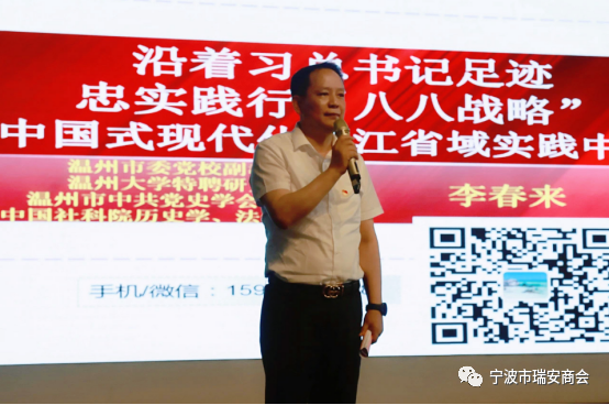 本次讲座邀请到温州市委党校副教授李春来为我们授课,主题是“沿着习总书记足迹,忠实践行‘八八战略’,在奋进中国式现代化浙江省域实践中建功立业”,李春来教授在讲座中以生动风趣的语言和丰富的典型案例,以民营企业及企业家的发展实际为基础,结合日常生活中的鲜活故事,涉及国际时事和文化民生,通过现场互动问答的形式,全面解读了中国式现代化的重要内容。他强调了政治意识对企业发展和个人成长的重要意义,以及新时代下党员和企业家的责任担当。