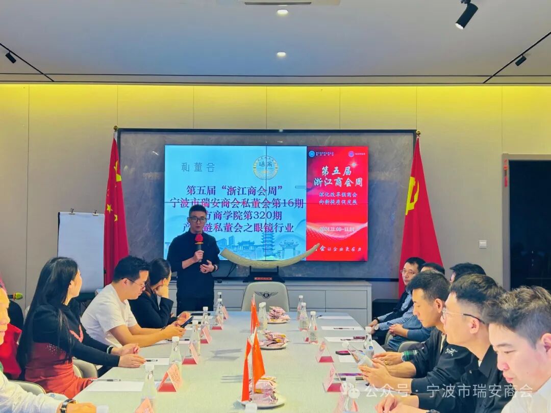 根据省工商联第五届“浙江商会周”活动通知精神,2024 年 11 月 13 日,宁波市瑞安商会举办第十六期私董会。本次私董会聚焦眼镜行业,参会人员涵盖了眼镜行业的公司代表、工厂负责人以及零售店店主。